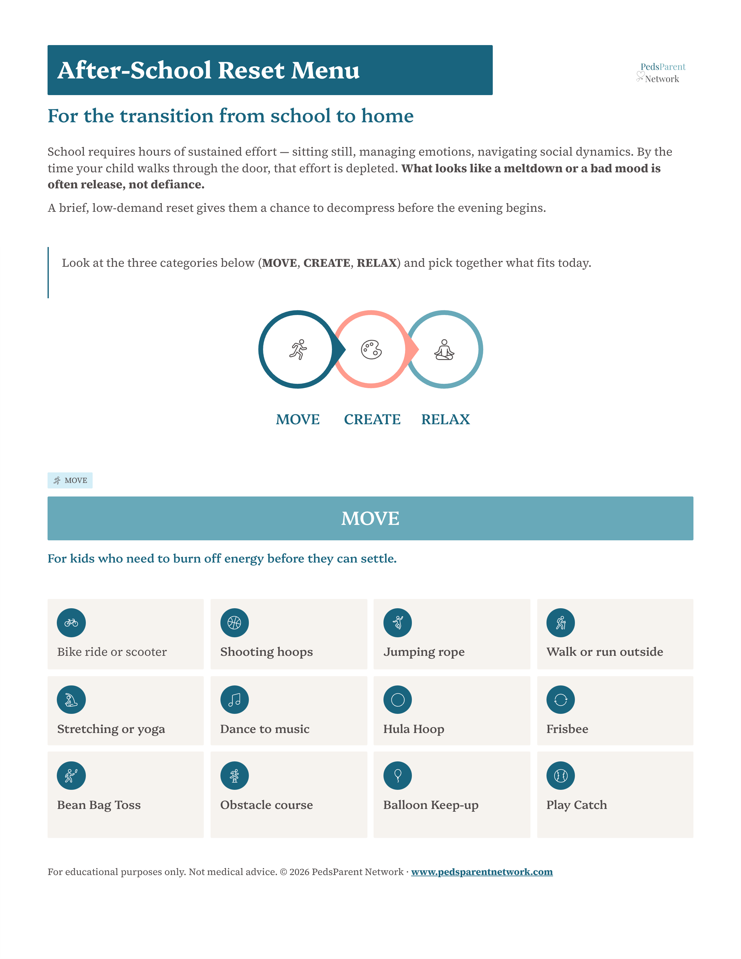 Free Printable: The After-School Reset Menu Simple, low-stimulation activities to help your child reset after school. Activities to help kids transition from school to home. Email Address * First Name * Educational only, not medical advice. By signing up, you agree to receive emails from PedsParent Network, including child health and wellness resources and occasional offers. View our Terms, Privacy Policy, and Medical Disclaimer. Unsubscribe anytime. I agree